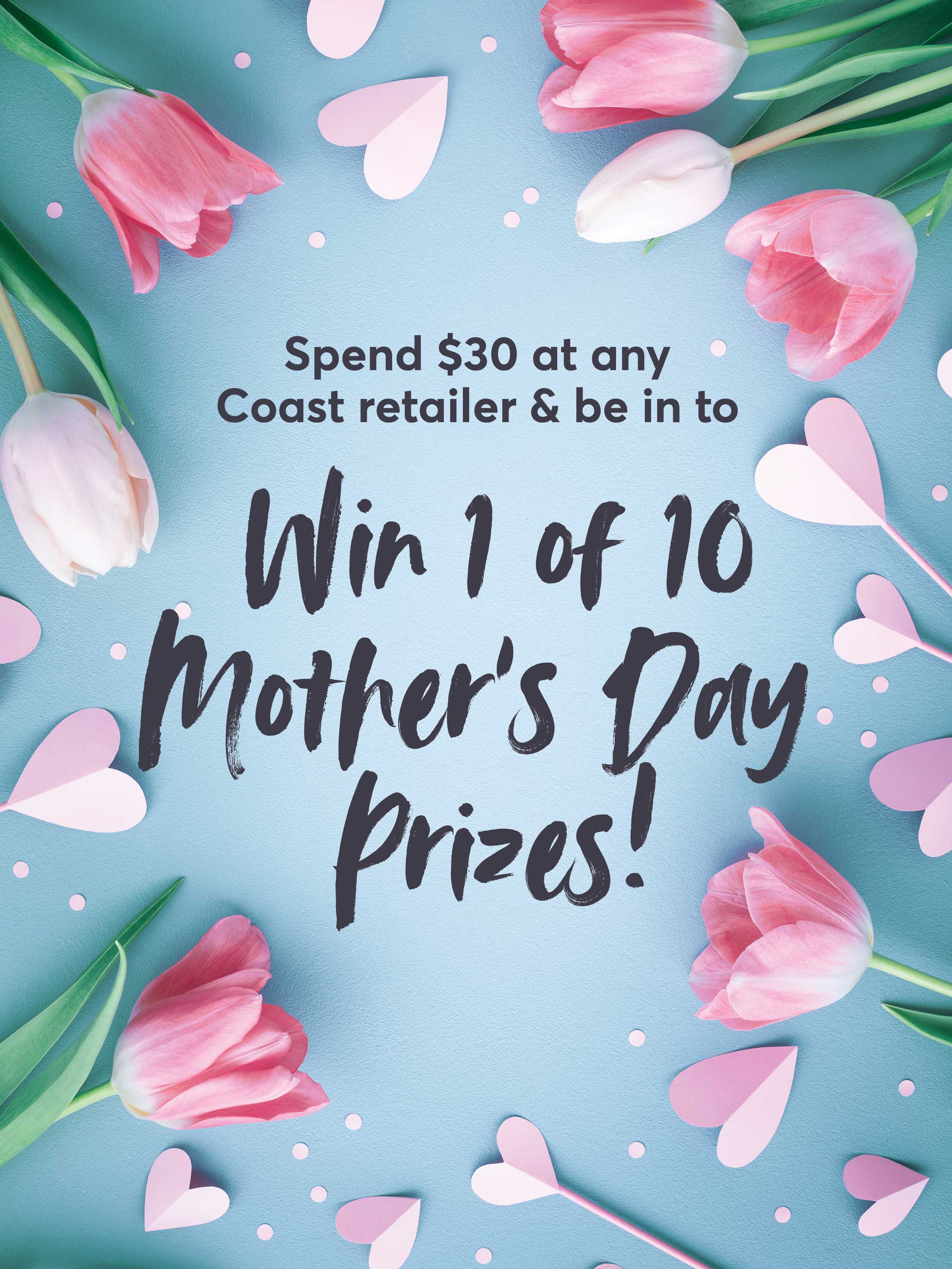 Simply spend in store before closing on Mother's Day Coast Plaza fill out an entry form and place it into the box provided in the Atrium (outside Woolworths).